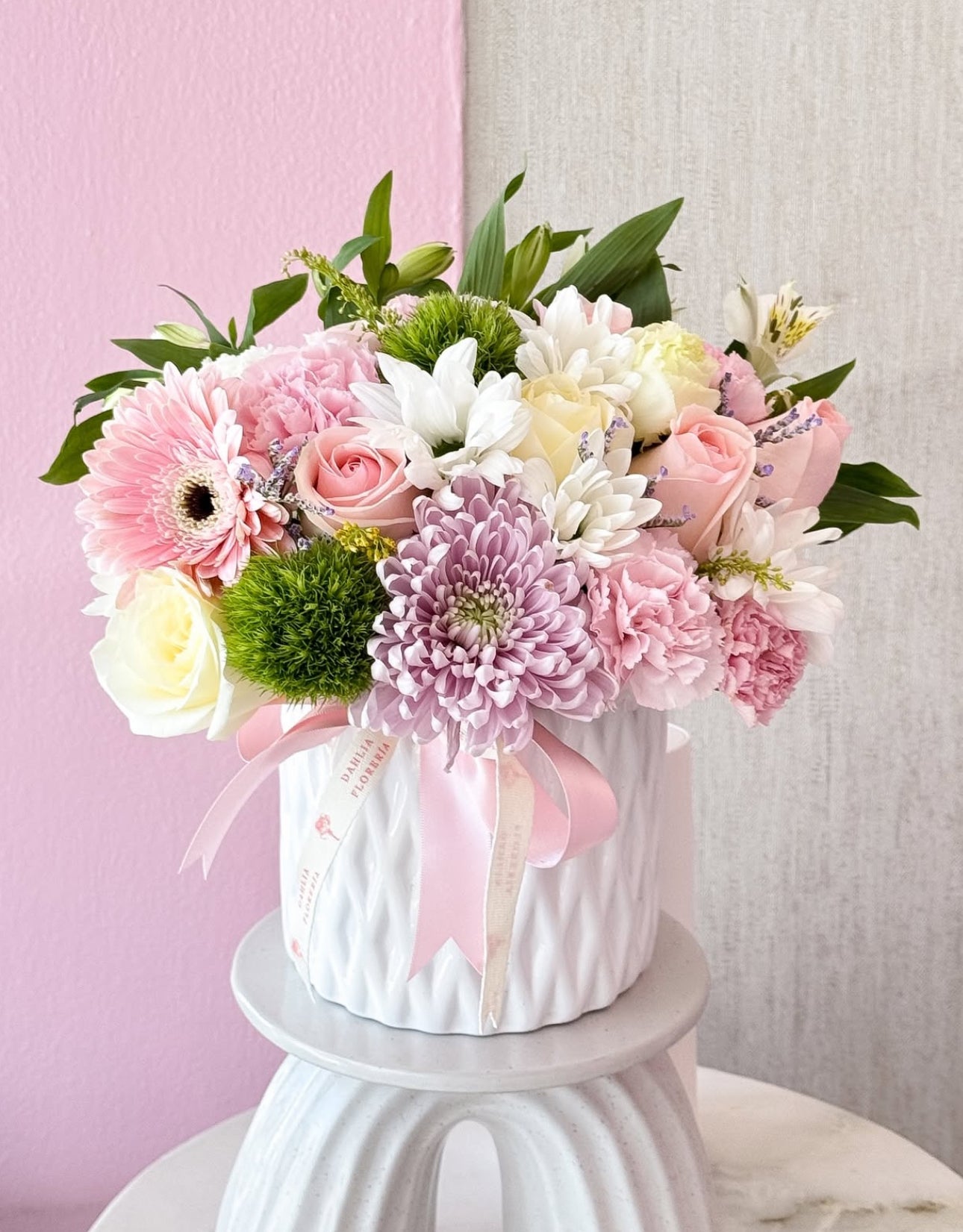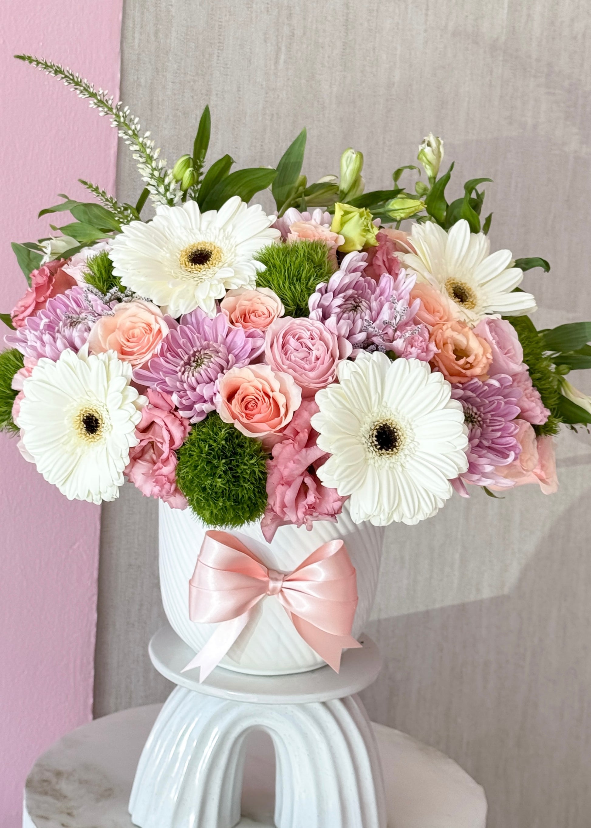 Small ceramic base with a variety of seasonal flowers, including gerberas/sunflowers, roses, mini roses, daisies, among others.