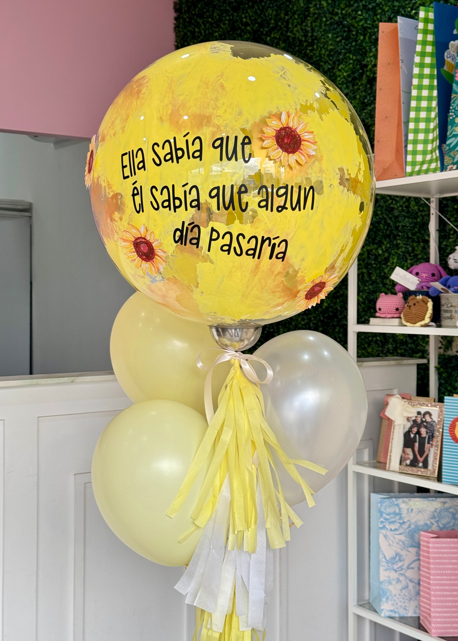 Este globo burbuja con temática de flores amarillas simboliza amistad, felicidad y energía positiva. Además, es 100% personalizable: puedes elegir frase, diseño y complementos para hacerlo totalmente tuyo.